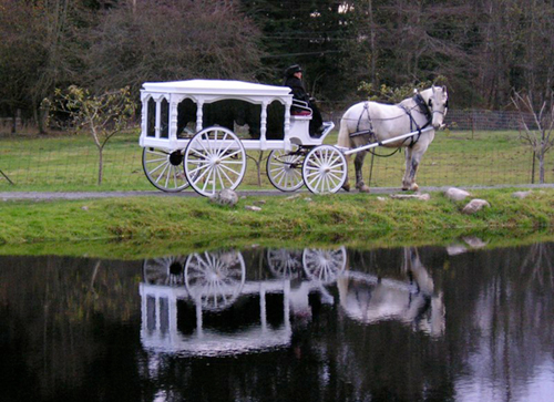 A horse-drawn processional carrying your loved one’s casket can bring honor and a sense of history to this final journey. The vintage 1840s horse-dawn hearse has original woolen curtains and is in perfect condition.