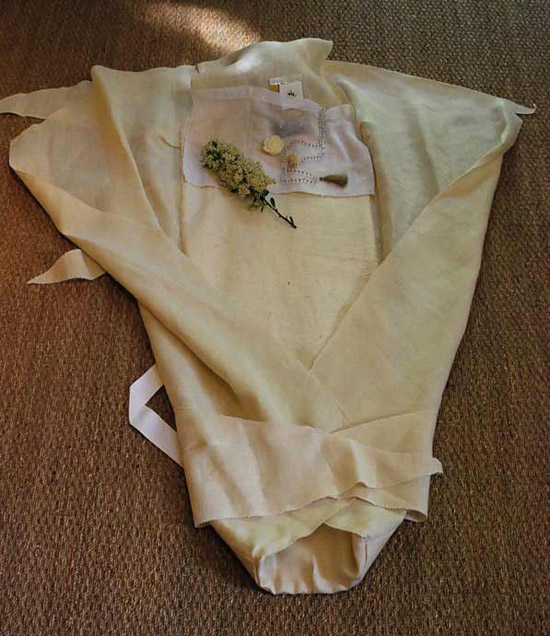 Esmerelda Kent of www.kinkaraco.com is a leading pioneer in the new shroud movement, and our preferred supplier. Her shrouds are works of art—like the saffron-colored silk Varanasi pictured here on this page. Kinkaraco offers special optional features: a heart pocket for mementos, and a lining of herbs and petals sewn by hand into the shroud. If used for cremation, this kind of shroud needs the rigid support of a cremation container; if used for burial, Kinkaraco’s patented Endfinity backboard with lowering straps can be attached, making it a good choice for green burial.